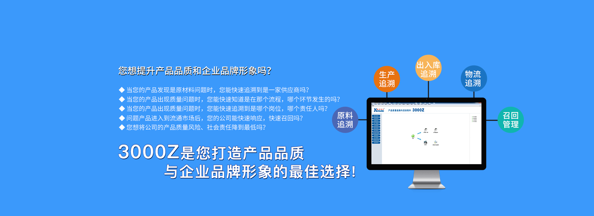 3000Z產(chǎn)品質(zhì)量追溯與召回軟件,涵蓋基礎(chǔ)資料,條碼管理,采購管理,銷售管理,倉庫管理,生產(chǎn)管理,賬務(wù)管理,消費(fèi)者管理,追溯管理,召回管理十大管理模塊,本產(chǎn)品利用先進(jìn)的信息加密技術(shù)為每件產(chǎn)品賦予唯一的“身份證號碼”,幫助企業(yè)對供應(yīng)商、原材料、生產(chǎn)車間、生產(chǎn)班組、生產(chǎn)負(fù)責(zé)人、產(chǎn)品銷售流向、經(jīng)銷商實(shí)現(xiàn)實(shí)時(shí)的全面監(jiān)控,真正從原材料到生產(chǎn)加工到產(chǎn)品銷售去向進(jìn)行全程質(zhì)量追溯,降低產(chǎn)品質(zhì)量問題對企業(yè)和社會(huì)帶來的不良影響。